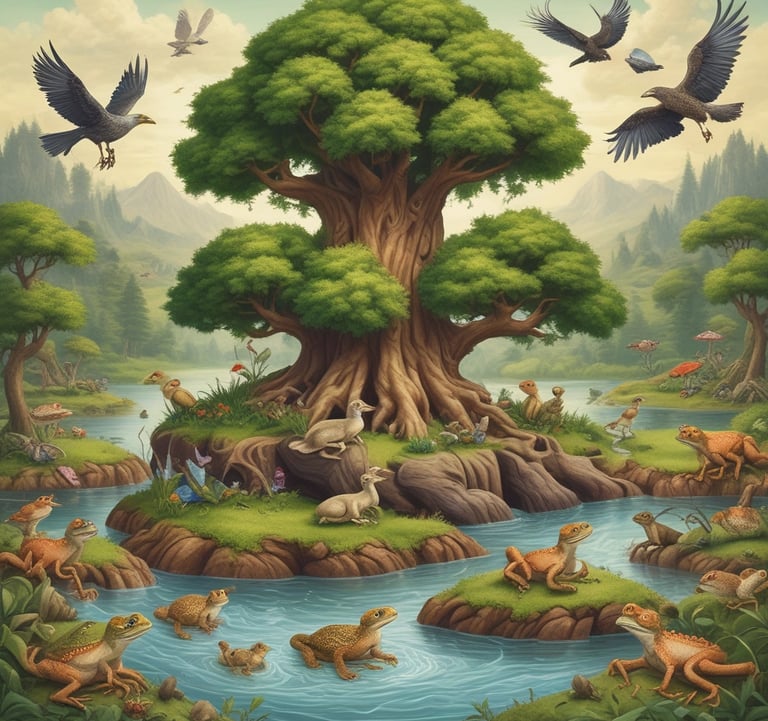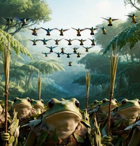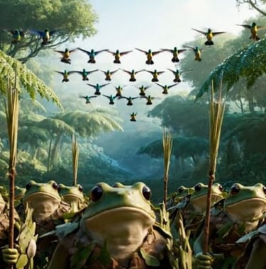 They are portrayed as skilled and innovative creatures, engaging in various tasks, from constructing musical instruments to manipulating their environment through teamwork and problem-solving. The description highlights not only the vibrant reliance on bioluminescent insects for illumination but also the rigorous training and preparation of young frogs, led by mentors who instill values of cooperation and self-control vital for their survival and growth.